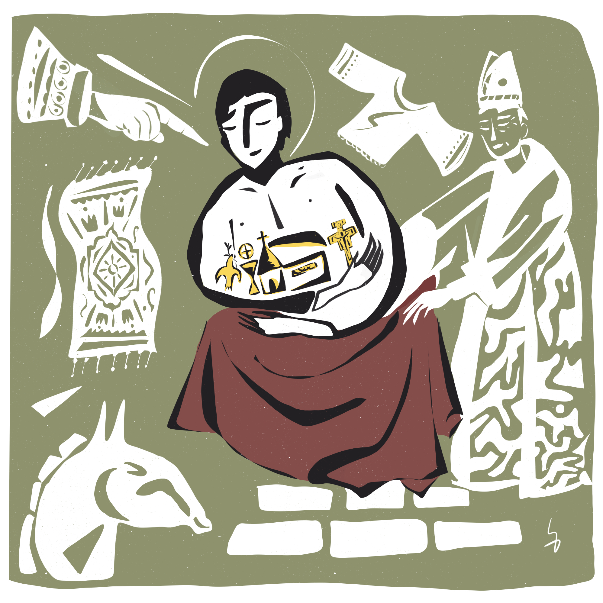 There are two parts to this illustration. Firstly, Francis strips himself naked of all the worldly possessions and these that used to surround Francis, do not tempt him like they used to. Francis is at peace as the bishop steps forward to cover him with his cloak and he is now committed to living for God and God alone.