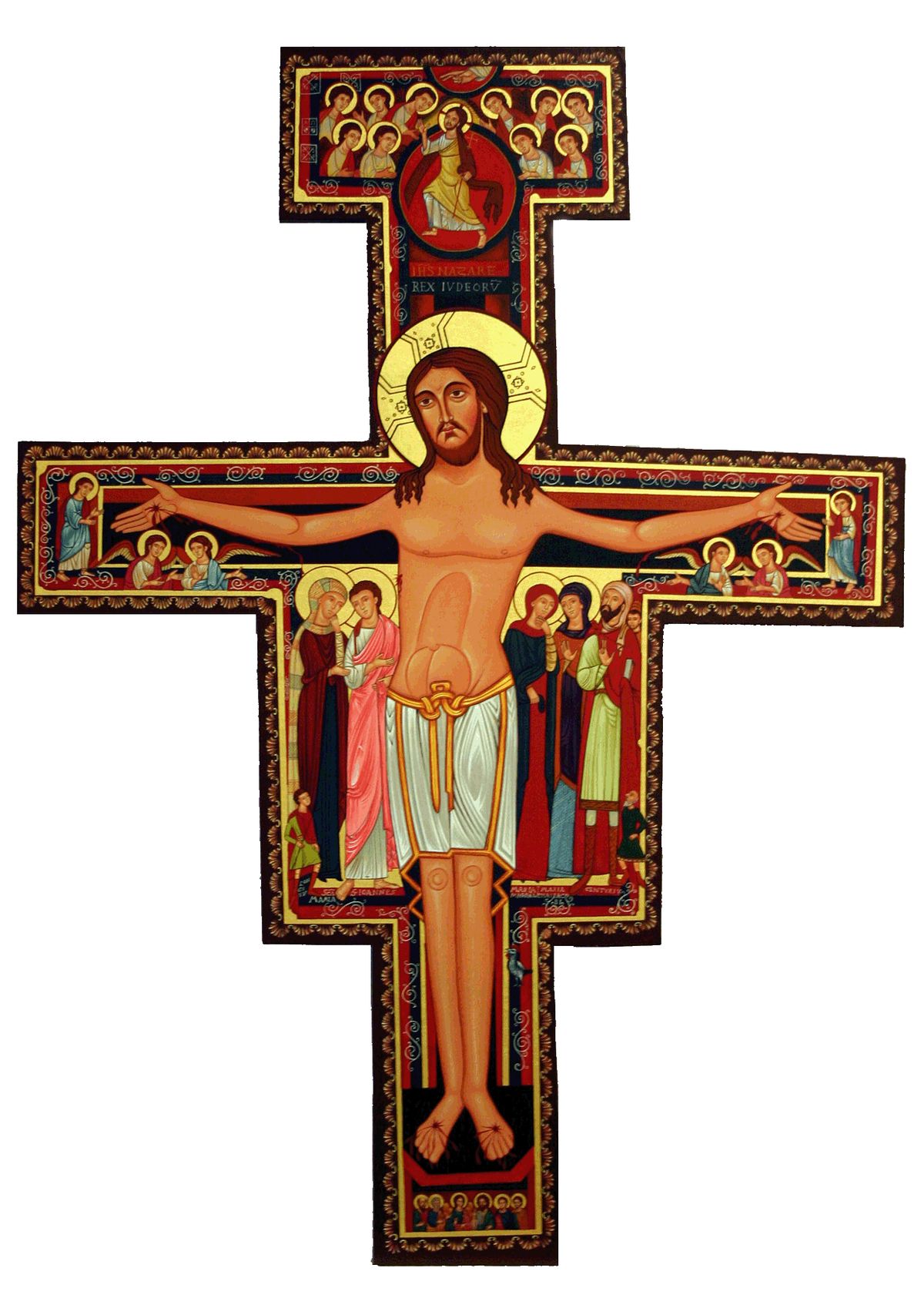 If you look closely at Christ on the San Damiano Cross, as painted on this cross, you will see that it is neither a bloody body nor one twisted in anguish. Rather his body is quite luminous, as if it were already his risen body, radiating the fullness of God. Instead of a crown of thorns, moreover, Christ’s head is surrounded by a glorious halo. And his body with outstretched arms appears to be ascending to heaven. In short, the image clearly suggests that it represents Jesus rising into glory.