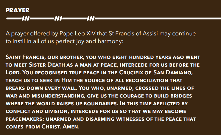 A prayer offered by Pope Leo XIV that St Francis of Assisi may continue to instil in all of us perfect joy and harmony